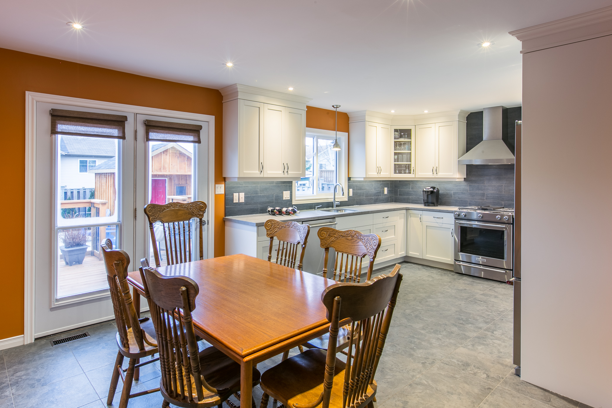 Wall between kitchen and dining room removed. Walls and ceilings were made ready for new custom kitchen, paint and backsplash - Smithville, ON